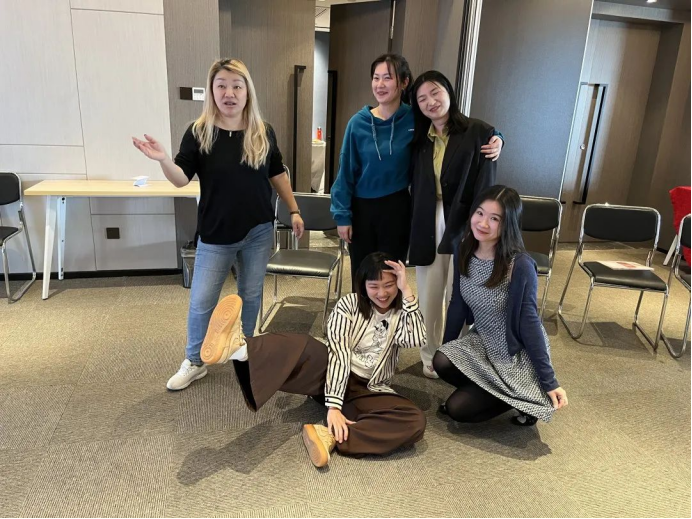 第二组老师在《Five Rabbits 》的幼儿英文童谣课中运用了Name Game、空间漫步、抱抱好人数、定格画面、思路追踪、巡回演出、线索材料等戏剧游戏和范式。目标在于创设故事情境,提升员工的肢体表达。学员老师通过韵律化的活动带领方式,把“员工”们带入故事情境当中,老师入戏成狐狸来跟员工互动,并生成属于员工自己的肢体创意表达。