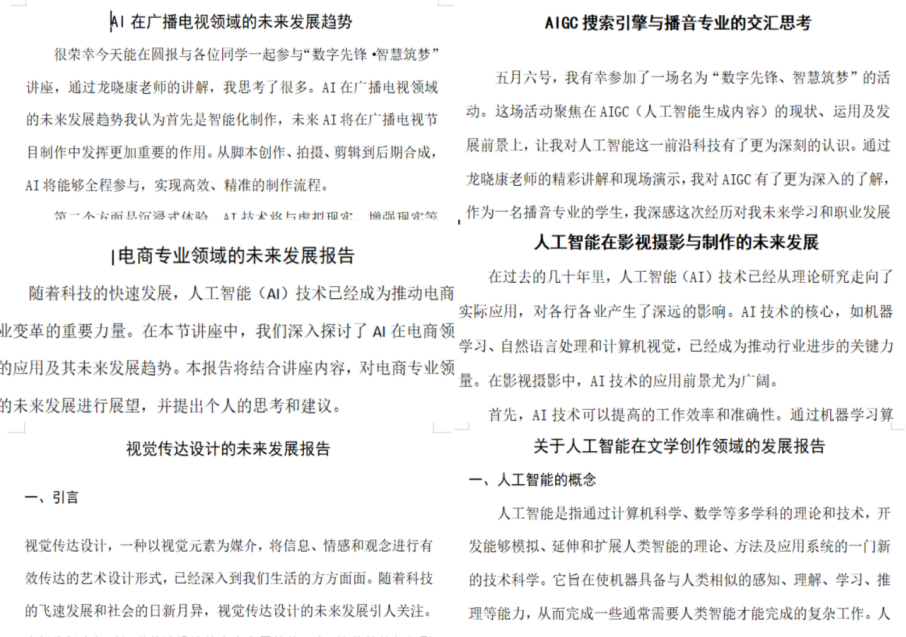 此外,同学们在讲座结束后还提交了关于人工智能技术在自己所在专业领域的未来发展报告。这些报告涵盖了汉语言文学、英语、播音、电商、大数据与人工智能、电子信息工程、影视传媒等诸多专业领域,同学们在报告中展现出了巧妙的创意与洞察力,将各自深厚的专业知识与前沿的人工智能技术相结合,不仅体现出人工智能技术在不同专业领域内无尽的潜力和无限的可能性,还让我们看到同学们在报告中为推动党建事业发展所展现出的智慧力量。