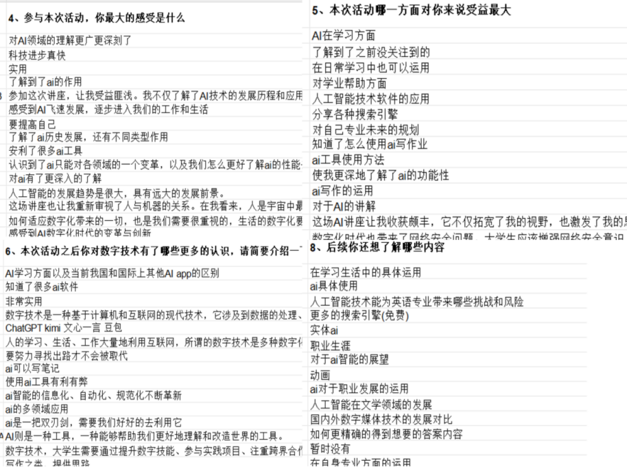 讲座结束后,球王会老员工党员服务站面向员工听众针对讲座内容发布了调查问卷。许多同学在问卷中纷纷提到自己在这场讲座中受益匪浅,不仅在这里学习到了关于人工智能技术的新知识,也深刻认识到了人工智能技术对社会发展和个人成长的重要影响。同学们还表示,希望未来此类活动能够更聚焦于数字技术的实际操作应用与案例分析,深入展示其在实际工作中的显著成效和广泛应用场景。