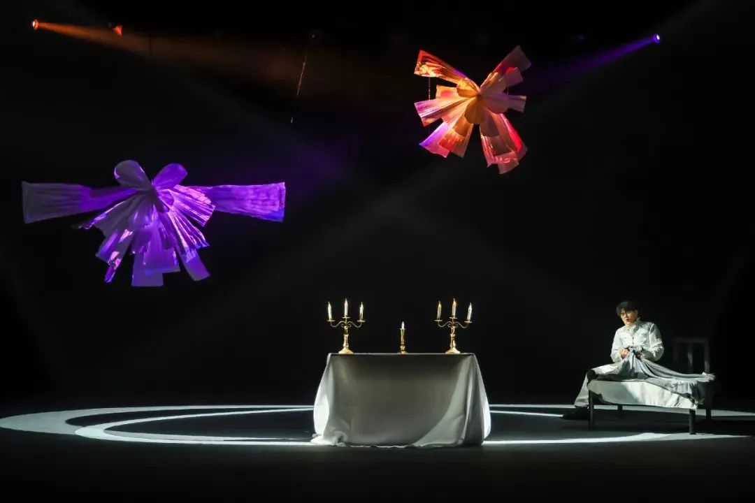 本次舞台设计由音乐系主任王皓亲自担纲,以音乐符号学为主旨思想,低位造型展开双翼,隐喻神父的悲悯让主角冉阿让的思想受到了洗礼;高位造型为盛开的花朵,代表芳汀的纯洁心灵。再巧妙利用舞台人物和道具制造出三角、十字和圆形,配合灯光,能契合剧情,并承载故事线条发展。