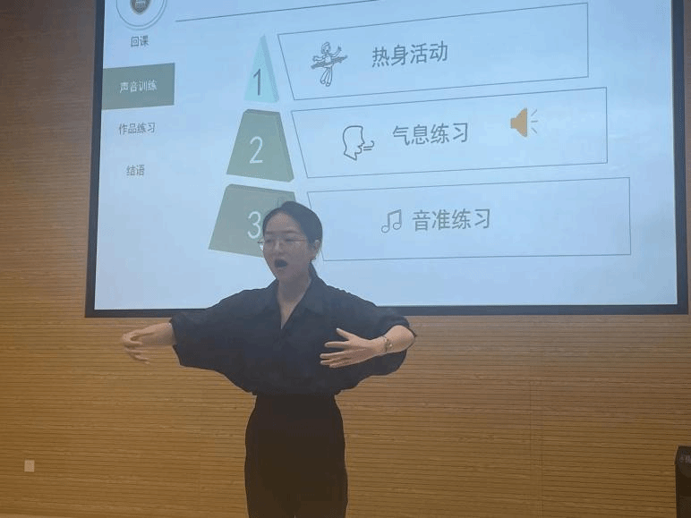 王帧帧老师带领员工进行了《合唱1》课程的音准训练。她通过回课练习、声音示范和作品分析,逐步引导员工理解合唱的音准要求,并进行完整的作品演唱,强调了从主题到调性分析的全方位教学方法。