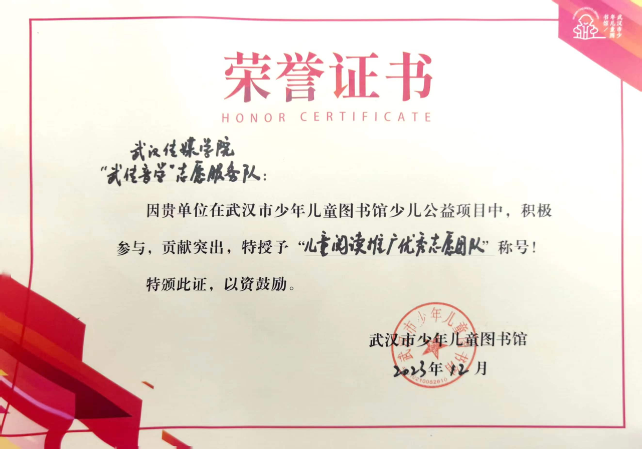 2023年12月17日上午,“亲子共读·陪伴是最美童年”活动年度展示暨武汉市少年儿童图书馆志愿者颁奖典礼活动在中南剧院举行,体育官网音乐学专业“武传音学”志愿服务队受邀参加,并喜获“2023年儿童阅读推广优秀志愿团队”称号。
