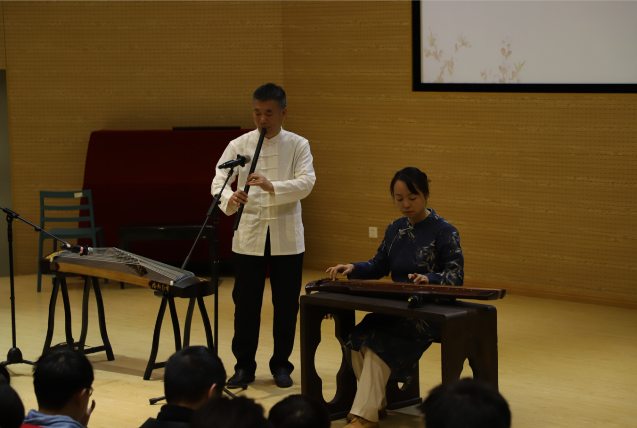 在张佑堃老师和林一蓓二位老师的演奏下同学们欣赏到了精彩绝伦的琴箫合奏,大家和老师们一起深深地沉浸在音乐之中,每个人的脸上透露着认真、好奇,随着音乐的起伏思绪也跟着波荡。
