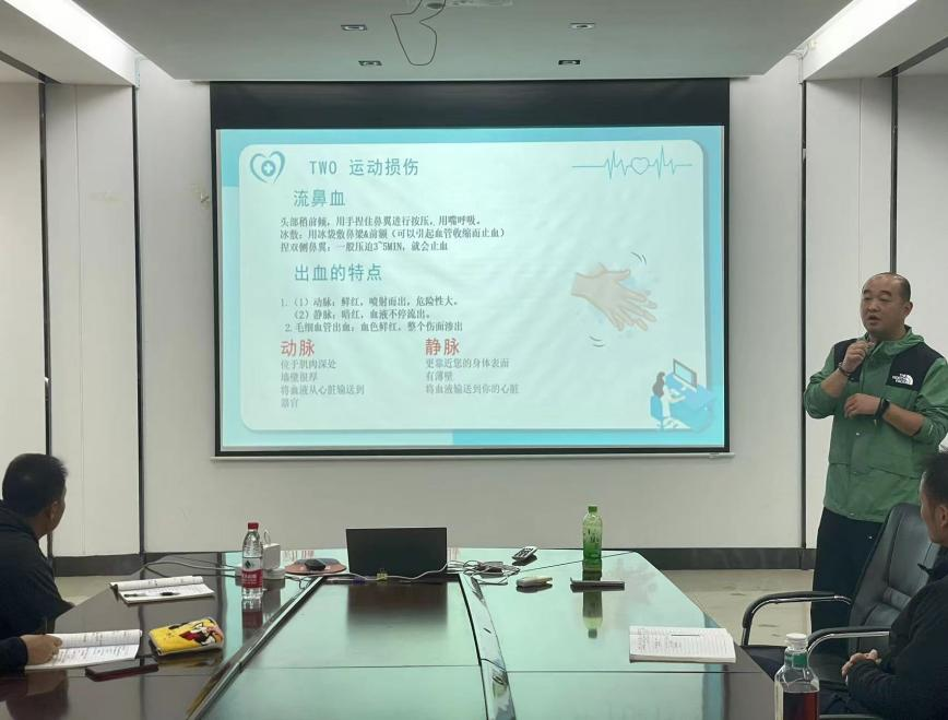 而后,黄蕾老师针对在老员工体质健康测试工作中常见擦伤、中暑、虚脱、流鼻血、肌肉拉伤、肌肉抽筋等突发状况的症状及其处理方法进行的详细的讲解与示范。