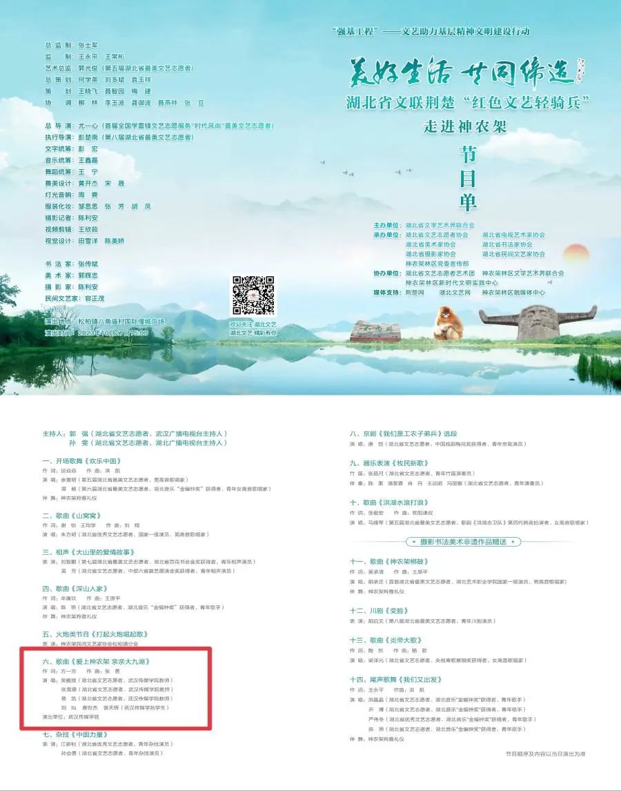 本次活动由湖北省文学艺术界联合会主办,湖北省文艺志愿者协会、湖北省电视艺术家协会、湖北省美术家协会、湖北省书法家协会、湖北省摄影家协会、湖北省民间文艺家协会、神农架林区党委宣传部共同承办。