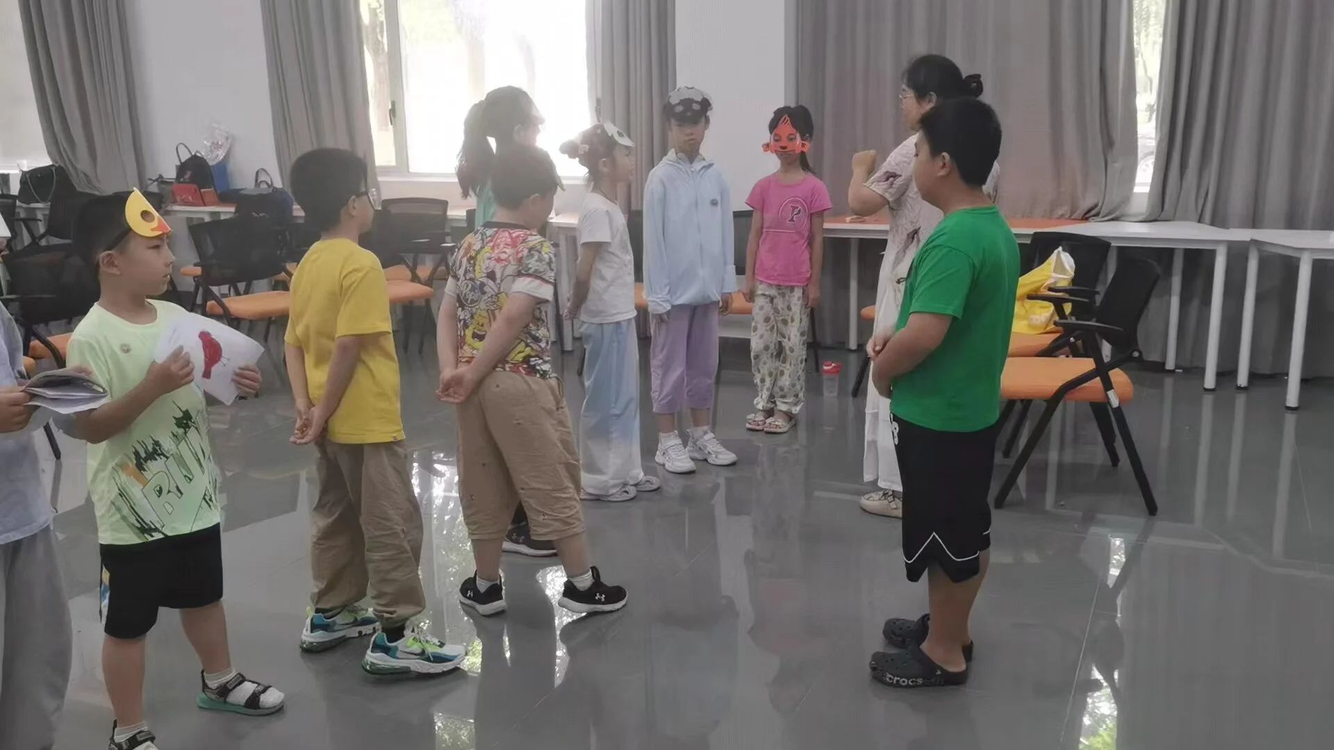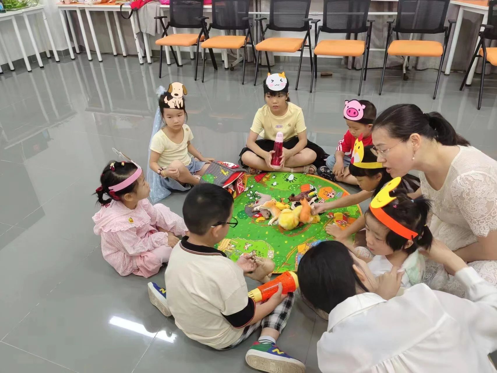 由李娟老师负责的绘本排演活动所选择的绘本主题为“Old MacDonald Had a Farm”,小朋友们将进行分别饰演农场里不同的小动物,在李娟老师的引导下排演成完整的绘本故事表演。李娟老师首先教授了绘本中出现的有关动物与动物所发声音的单词,随后在绘本排练过程中带领大家尽可能发挥自己的想象力与创造力,并在排演过程中不断修改完善细节。