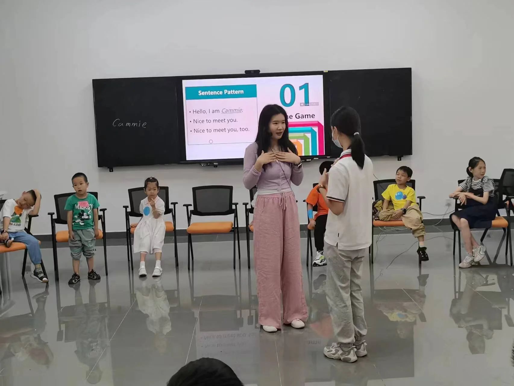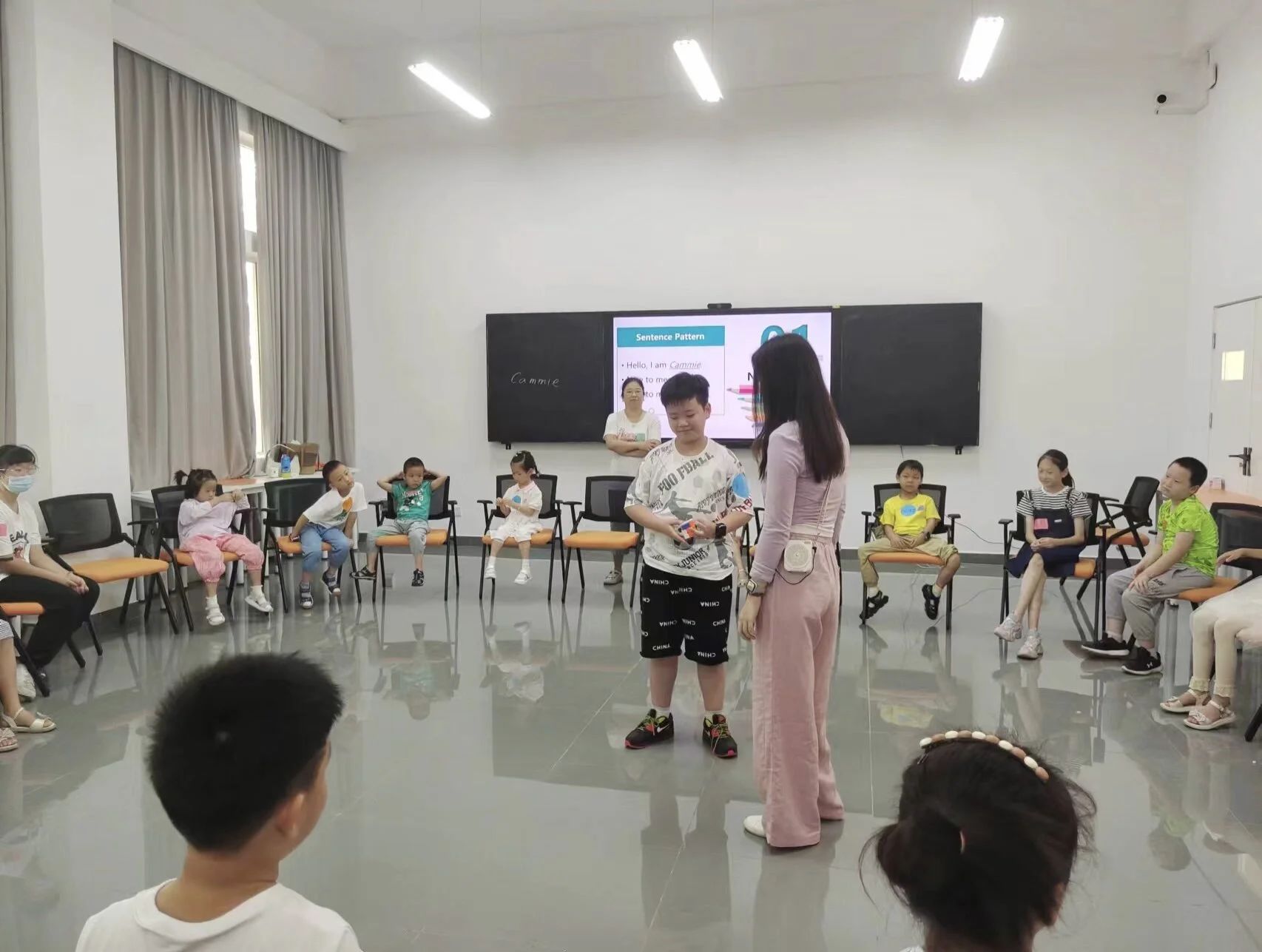 活动伊始,沈君仪老师为学员们简短介绍了本次实践内容,随后邀请每位学员以自信饱满的状态用英文进行互动,引导鼓励学员逐一进行简短的英文自我介绍,气氛十分活跃,孩子们积极参与,与老师一同沉浸在英文的海洋中。