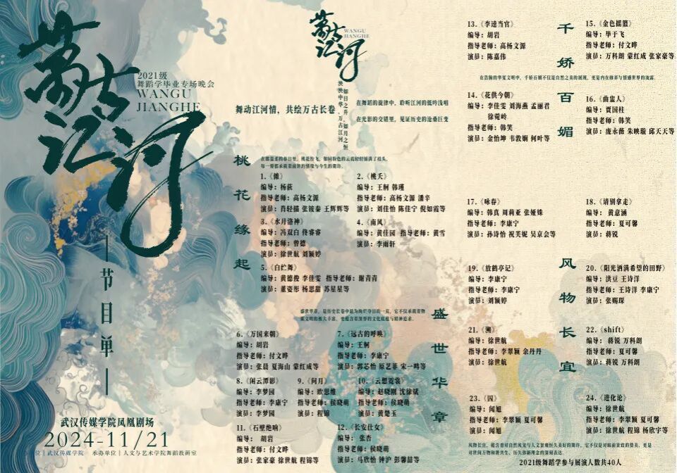 这片古老而辽阔的土地,见证了无数岁月的流转,如同日之初升,月之恒久,永恒地诉说着民族的辉煌与梦想。而今,舞蹈学专业2021级的员工即将以舞蹈为笔,以情感为墨,共同绘制一幅跨越时空的"万古长卷"。“万古江河”,不仅象征着中华民族悠久的历史和源远流长的文化,也寓意着同学们在舞蹈艺术道路上不断追求、不断超越的精神。本场毕业晚会按中国舞蹈纵向历史的发展顺序进行编排,从远古到魏晋,从盛唐到宋元,从近现代到当代。让大家在欣赏舞蹈的同时,也能感受到中国舞蹈文化的深厚底蕴。