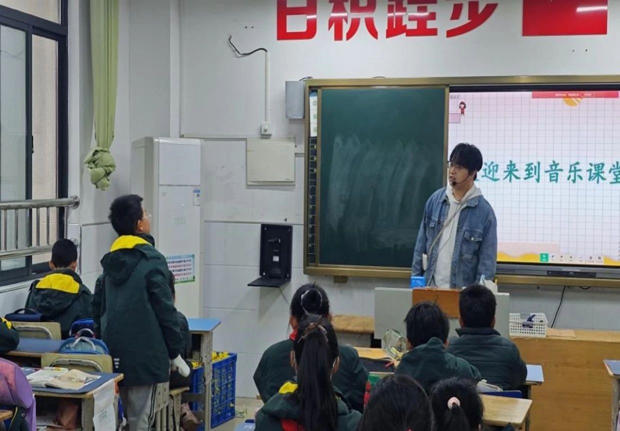 海文欣:通过这两周的实习,我深有感悟,既蕴藏着无数未知的挑战,也满载着成长的温馨与喜悦。初到武汉市光谷第八小学,我内心非常的激动与忐忑,并参加了实习见面会,而我也有幸作为员工代表上台发言,那一刻,我的心跳与激动同在,深感责任重大,却也满怀信心。在实习过程中,我分别对一年级、三年级和六年级的小朋友进行了授课,感受到了不同阶段的孩子,此外,童老师让我授课,并在课后给予我宝贵的评价与建议,帮助我不断提升教学能力。而我也深刻体会到了作为一名音乐教师的责任与使命。