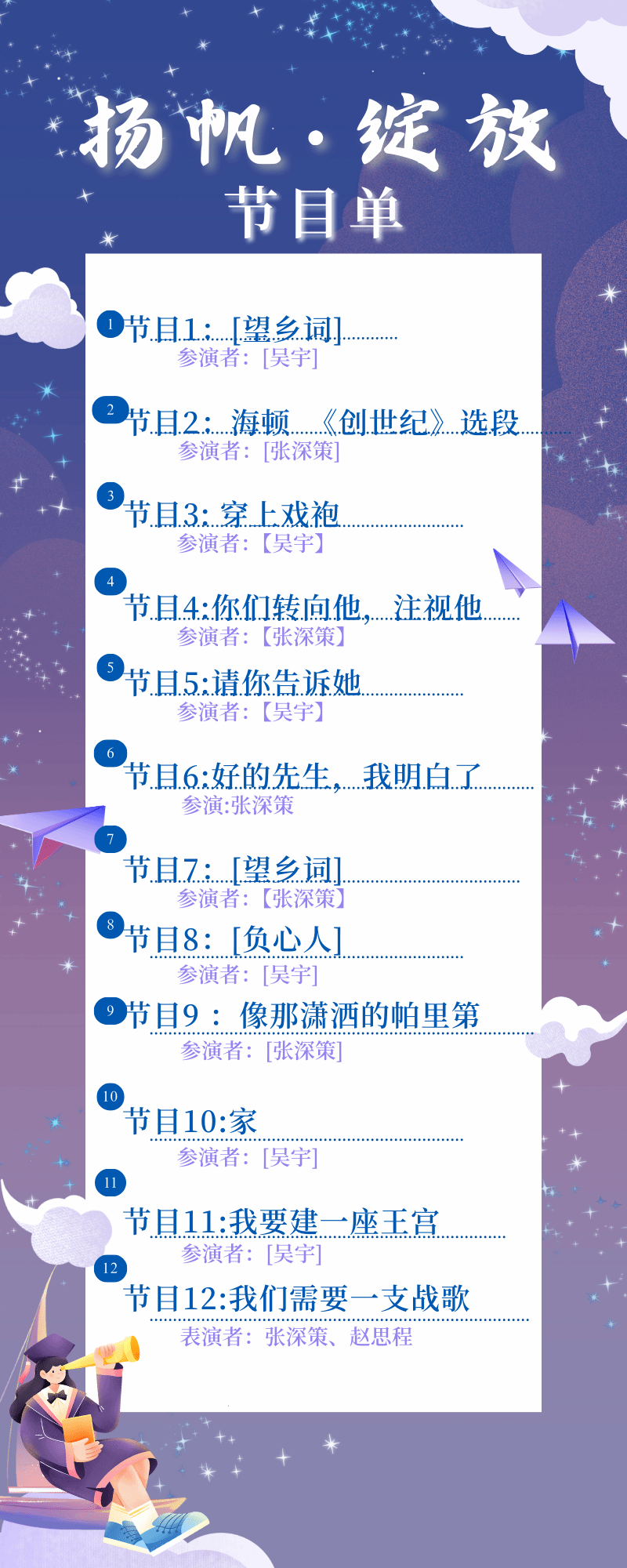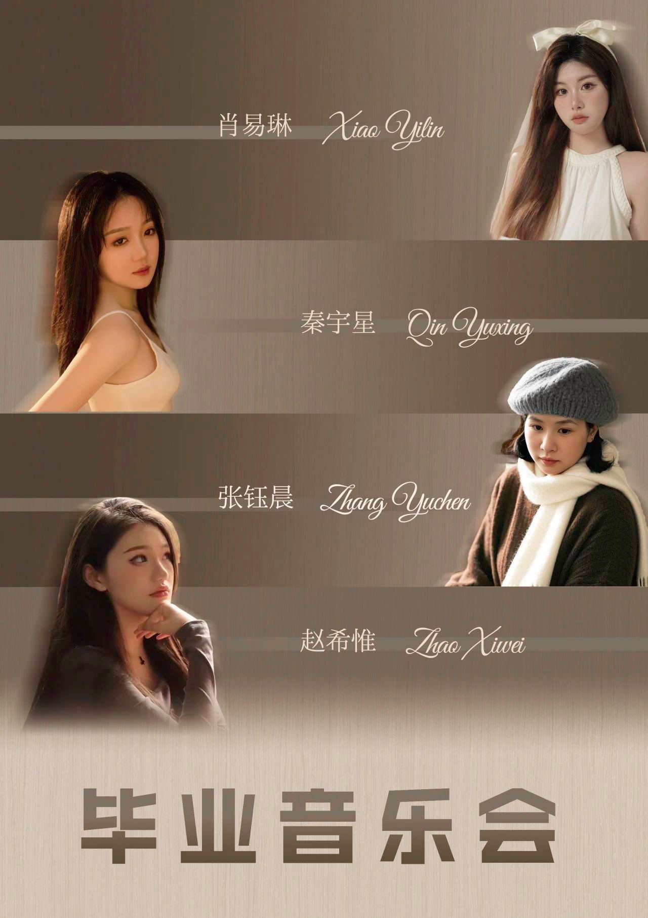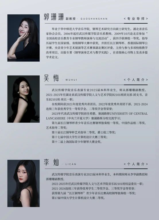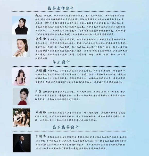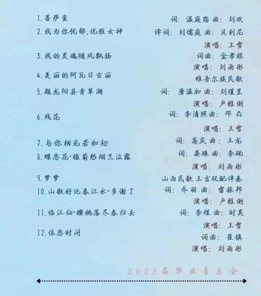 12位演员将代表音乐B2101班,用5场毕业音乐会向我们展示大学四年期间的专业学习成果。他们将用四年的汗水与泪水,编织成一首首动人的乐章。每一个音符,都是他们成长的见证;每一段旋律,都是他们青春的誓言。