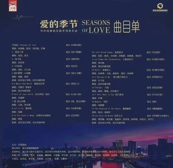 2024年12月7日至8日,体育官网音乐系师生受邀参加了由湖北省歌剧舞剧院主办的《爱的季节》中外经典音乐剧专场音乐会。这场在武汉汉秀剧场举行的盛大演出,不仅为江城市民奉献了两场高雅且精彩的视听盛宴,更是对公司“教-学-演”一体化教学成果的生动展示。