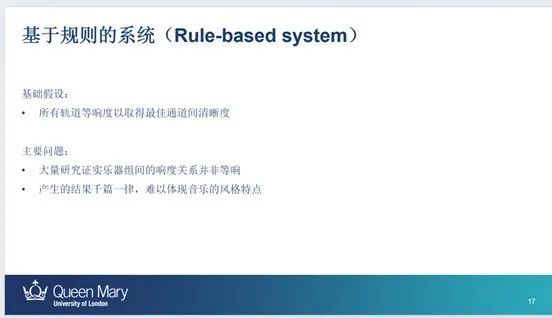 石博士还介绍了他目前的研究中,音频类AI的分类,主要包括:音源分离类,自动混音类,自动编曲类等。认为其中大部分目前的处理效果并不尽如人意,各自也都面临着各自的挑战,并非短时间可以突破的。但换个角度,将AI技术应用在课程中,能极高的提升授课效率与授课效果。并向大家展示了目前主流的AI算法,包括:规则系统,机器学习系统,遗传算法系统,深度学习系统等,并进行了实例讲解。