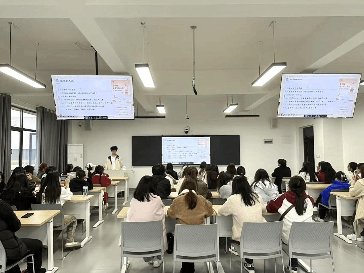 随后,乐明奕学姐将目光聚焦于大学竞赛。她推荐了几个含金量较高的竞赛和考试项目,如湖北省翻译大赛,英语四六级考试、普通话水平测试、计算机等级考试、外研社国才杯,楚才杯、笃行杯、诗词大赛。包括如何选择适合自己的竞赛项目、如何组建优秀的团队以及在竞赛过程中如何克服困难、战胜困难。乐明奕学姐特别提到,以赛促学,在备赛的过程中进步才是最快的。她鼓励同学们要勇于挑战自我,积极参与竞赛,锤炼过硬本领,迎接时代挑战。