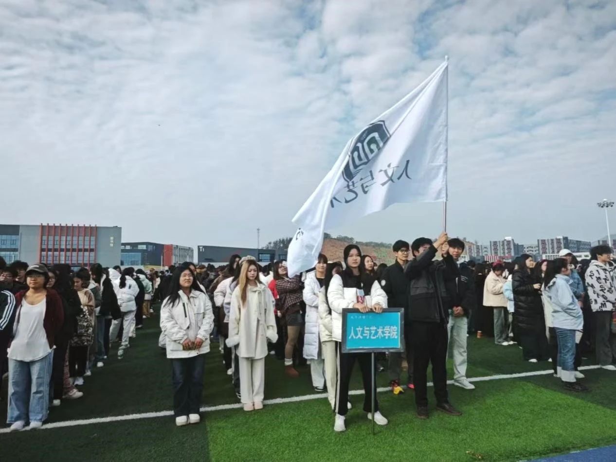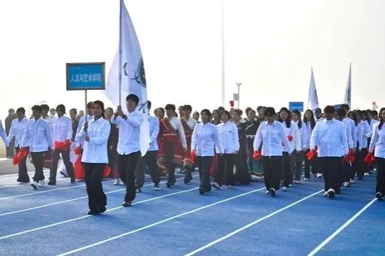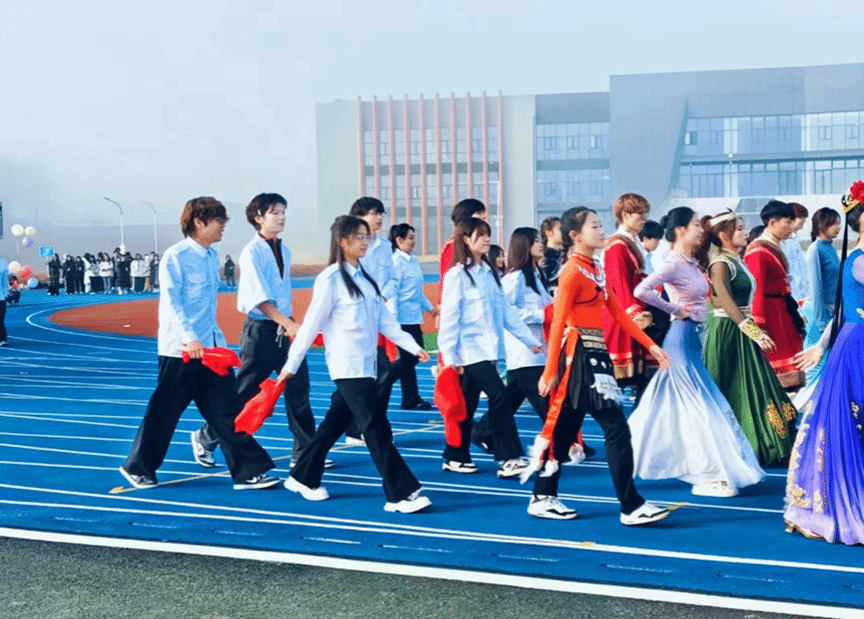 秋意深浓晨曦初现,在氤氲薄雾中我们迎来了一场青春与热血碰撞的体育盛宴。伴随着激昂奋进的乐曲,球王会代表方阵高举着旗帜步入主席台前方,那一抹抹鲜艳的中国红与五彩斑斓的民族服饰共同奏响着开幕式进行曲。在蓝白相间的跑道的映衬下宛如旖旎诞放的绚丽之花,将民族文化的灼灼华彩洒进众人眼眸。他们用舞蹈生动诠释着“文以载道,艺以修身”的院训,赋予了运动会别样的艺术韵味。