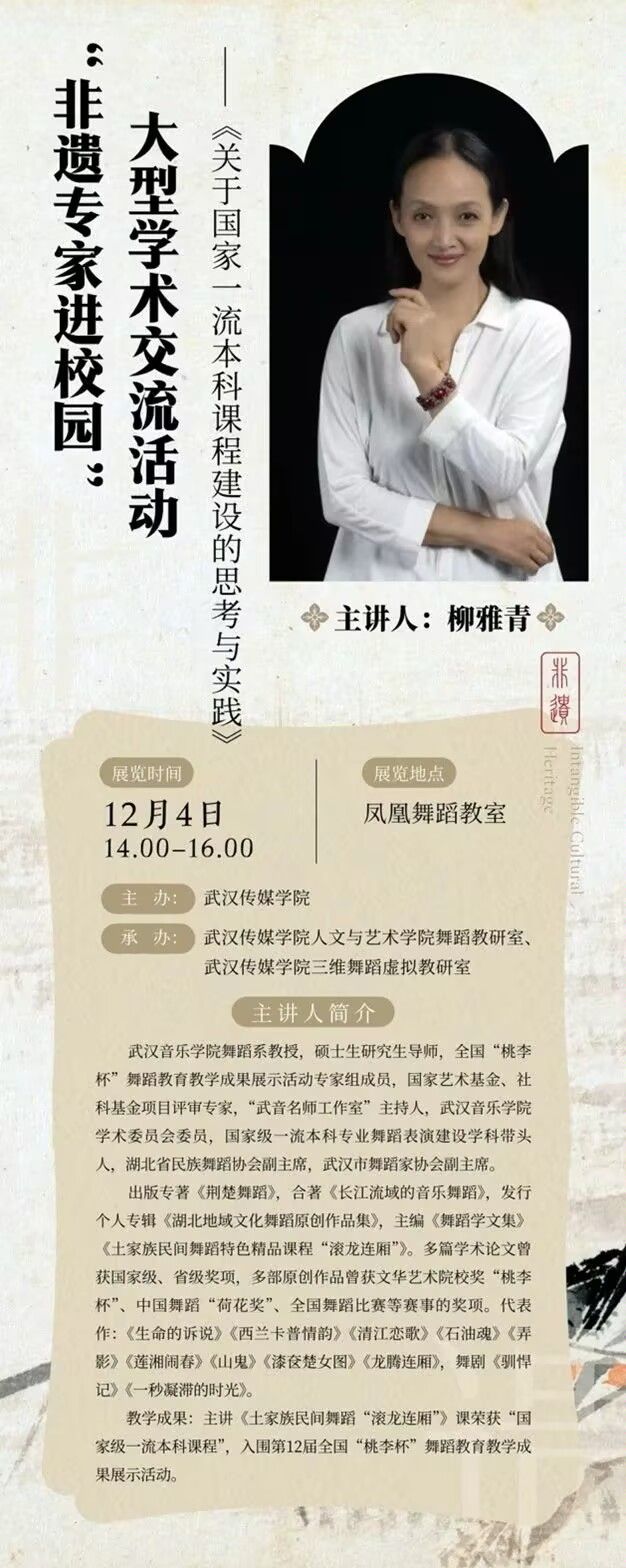 本次讲座及大师课旨在进一步推广湖北地域特色舞蹈文化,让荆楚舞蹈在更为广阔的舞台中得到孕育滋养。通过邀请知名专家学者与非遗传承人进校园,为师生们搭建一个学习、交流、传承的平台,共同推动中华优秀传统文化在高校的传承与发展。