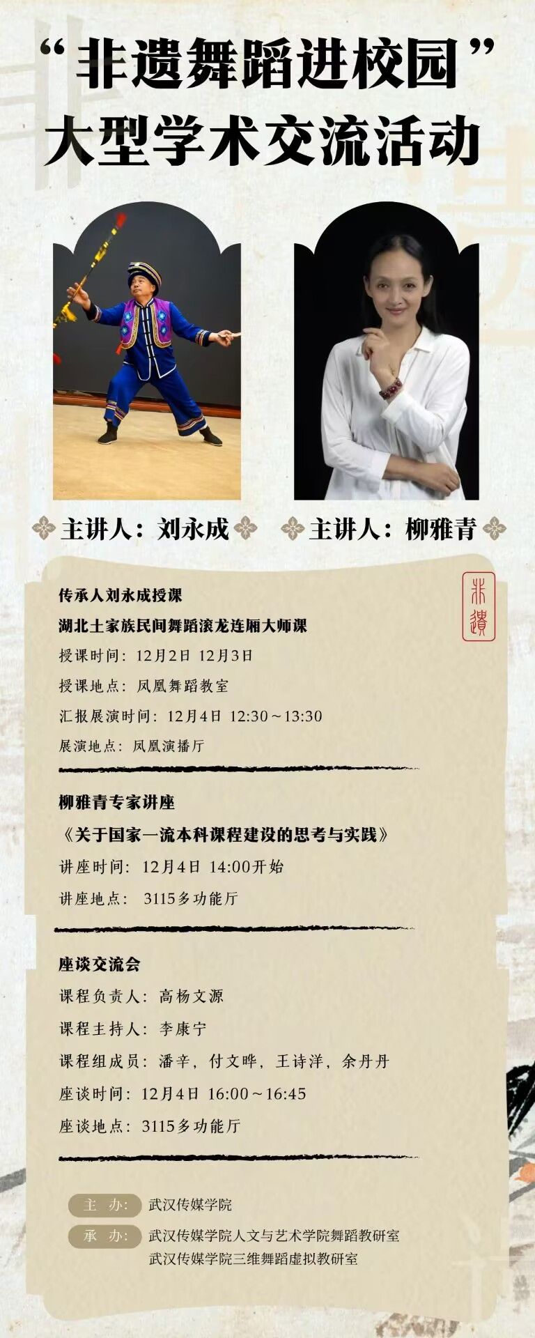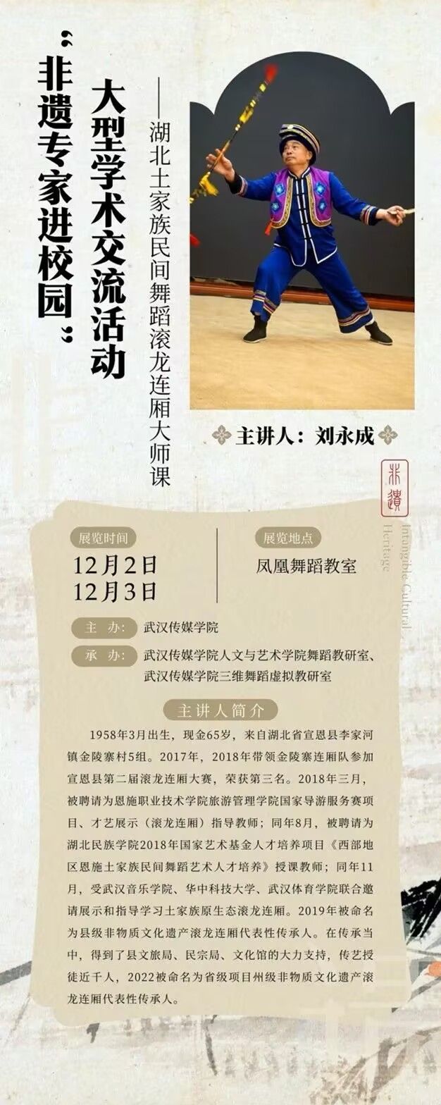此次恩施州宣恩县非遗舞蹈进校园的交流活动,邀请到武汉音乐公司舞蹈系柳雅青教授,及湖北民间舞蹈“滚龙连厢”洲际传承人刘永成。