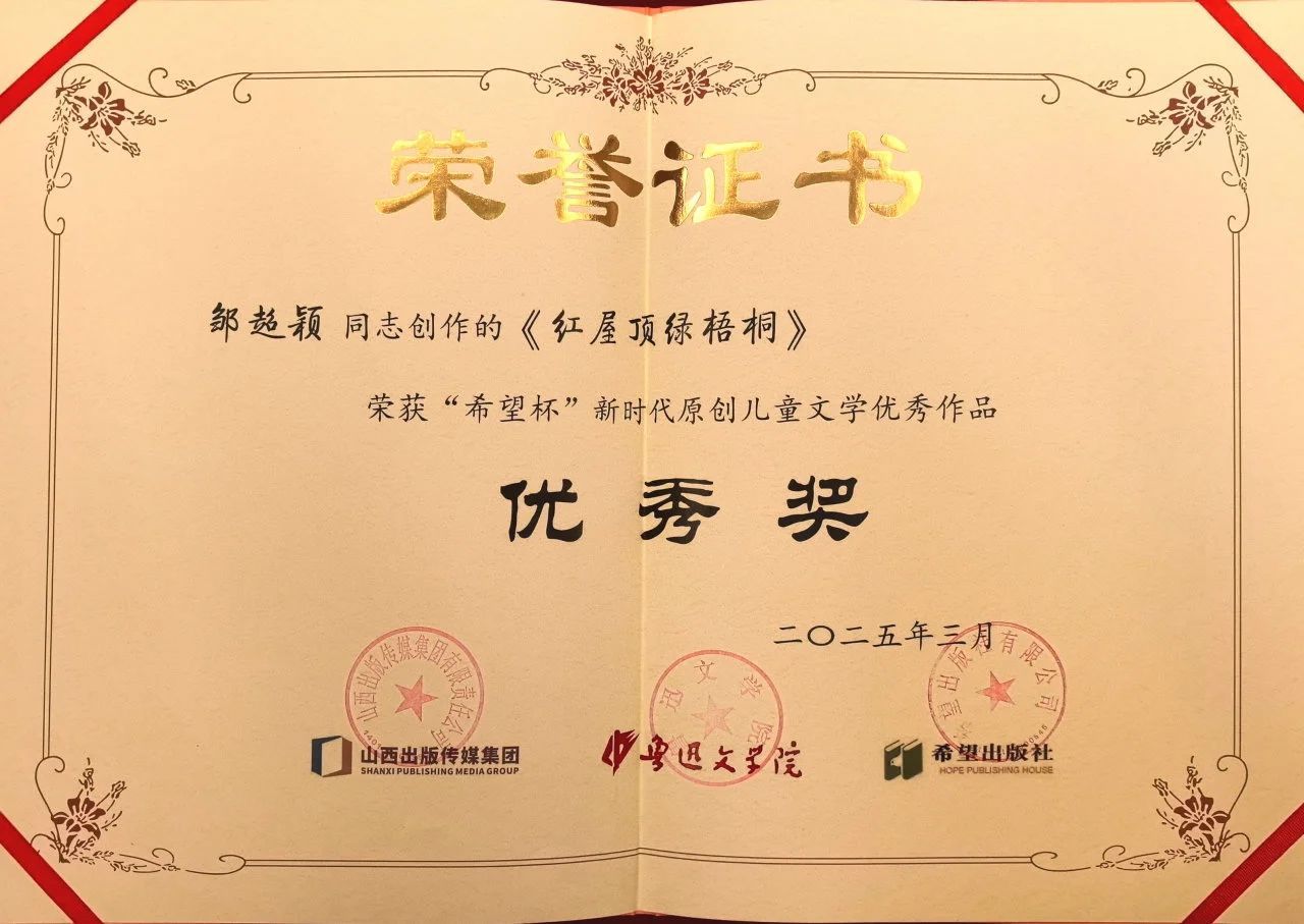 3月9日下午,“希望杯”新时代原创儿童文学优秀作品奖在北京颁布,公司球王会副教授、驻校作家邹超颖创作的长篇小说《红屋顶绿梧桐》,从475篇作品中脱颖而出,荣获优秀奖。