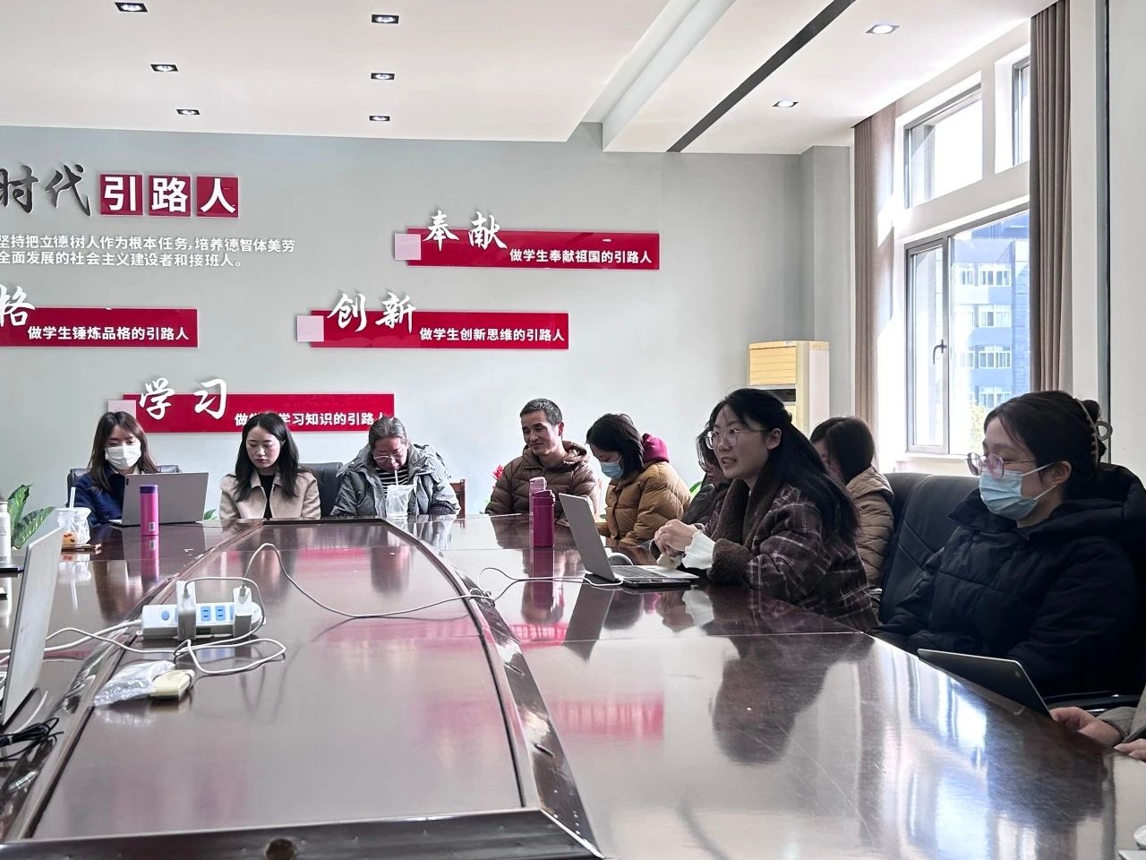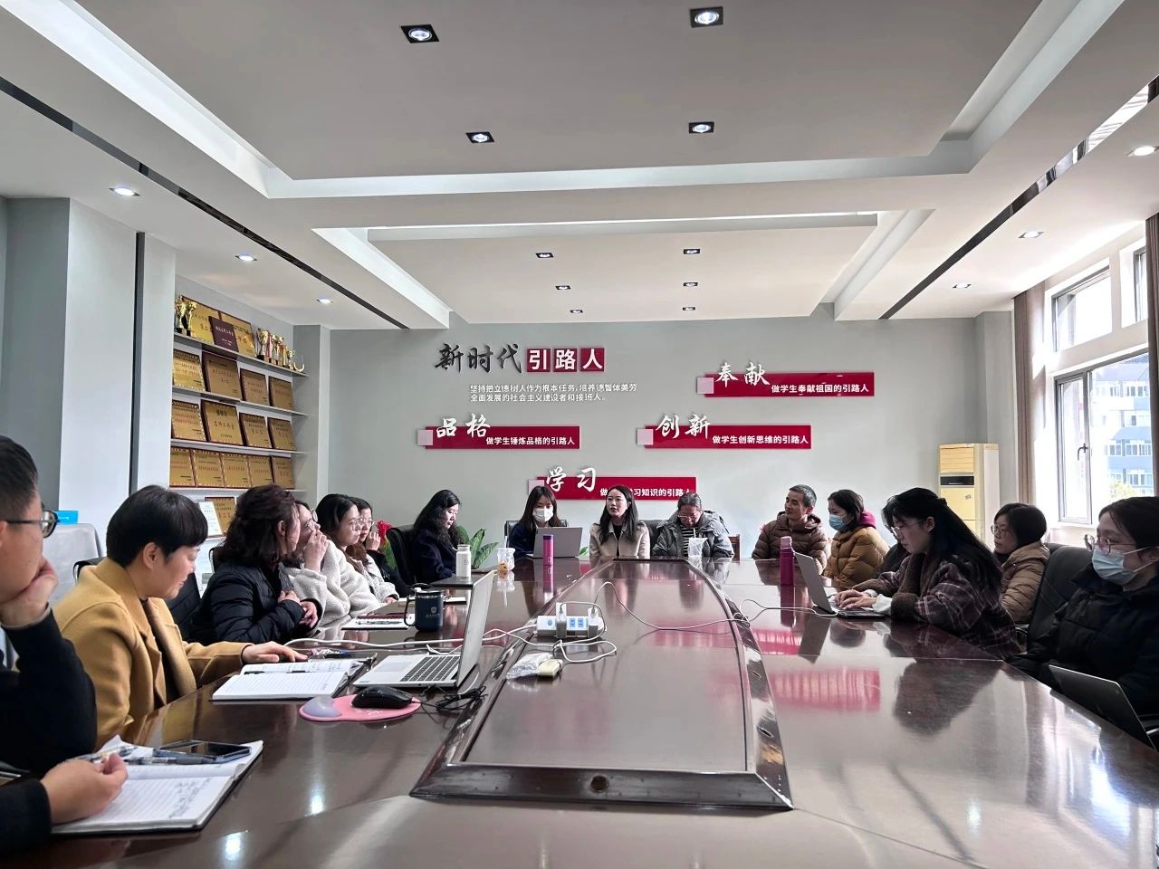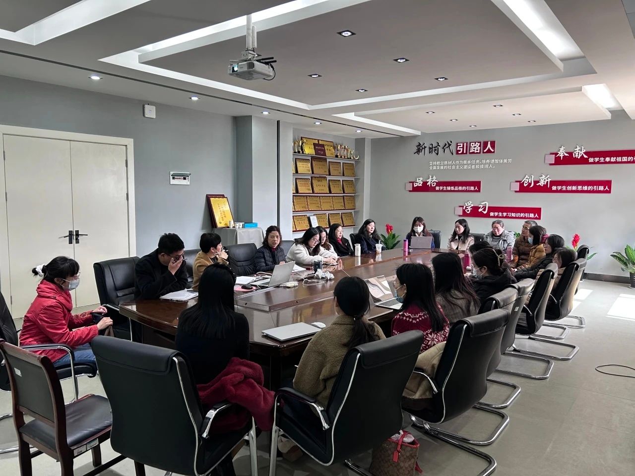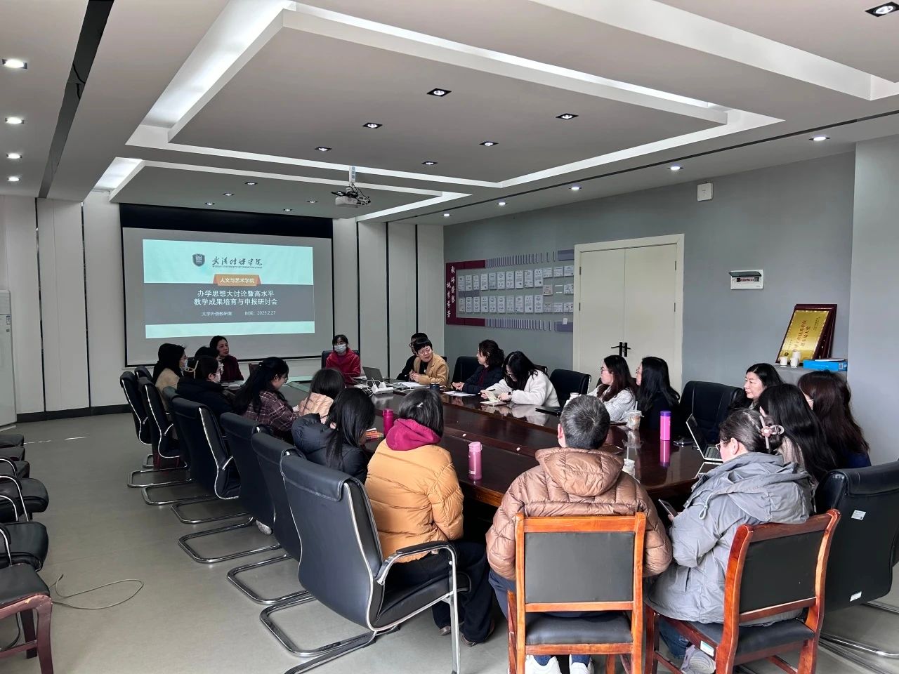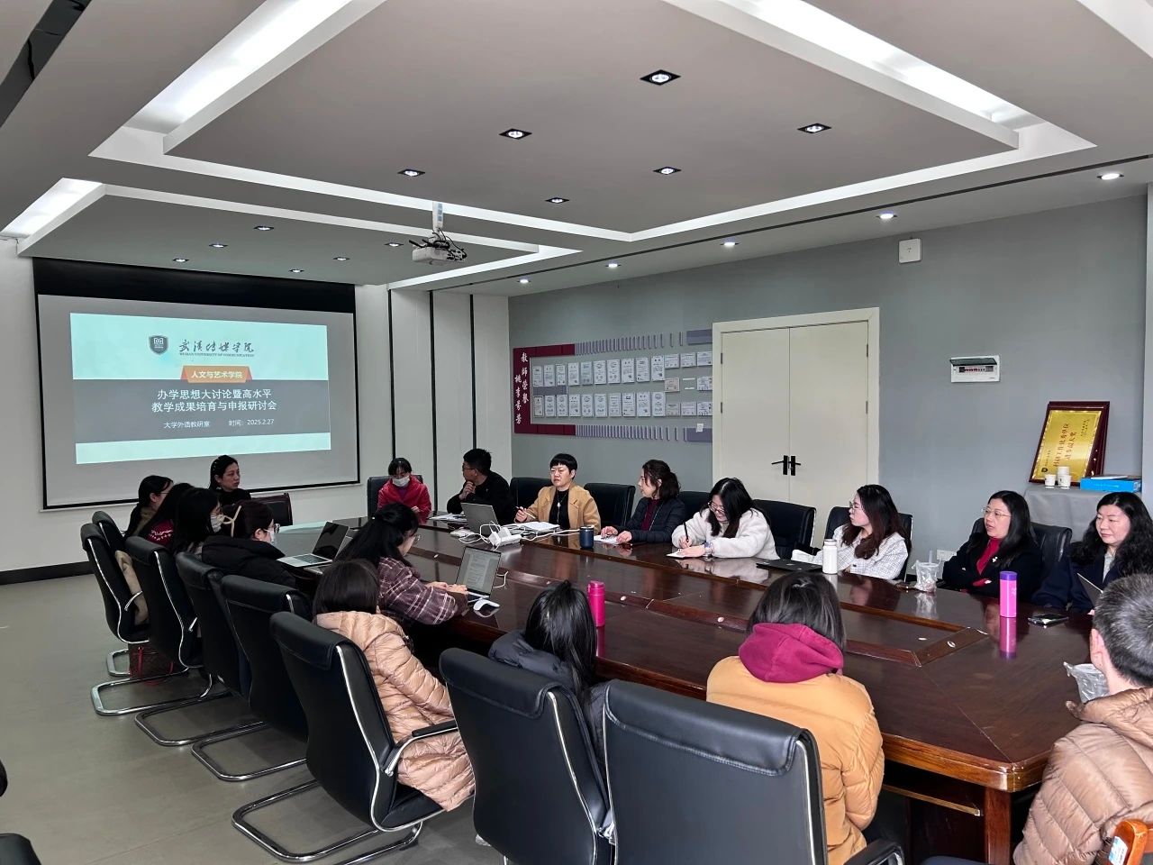 2025年2月27日下午大学外语教研室办学思想大讨论暨高水平教学成果培育与申报研讨会在球王会会议室举行,会议由王金平主任主持,盛经理、吴书记亲临指导,全体大外教师齐聚一堂,共绘新学期发展蓝图。