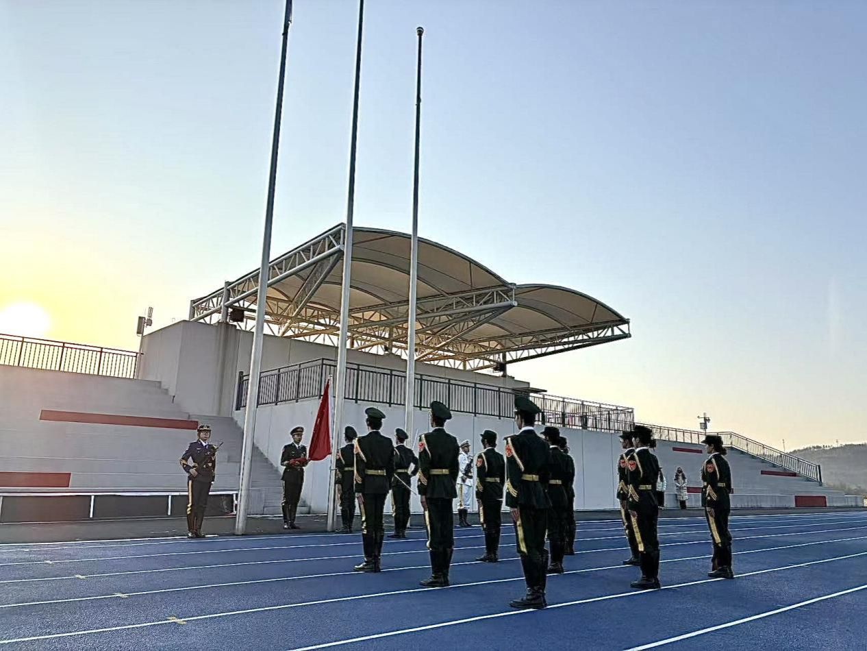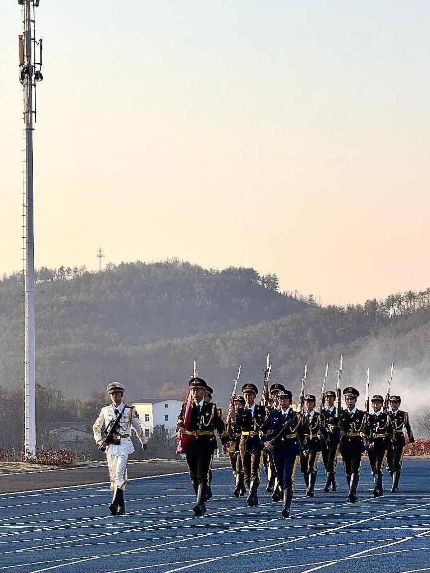 国护队员们身着墨绿色礼服,肩章上的金色勋章熠熠生辉,在晨曦映照下散发出夺目华彩。他们身姿矫健,目光如炬,每一步都踏响着信念的鼓点,穿过氤氲雾霭,伴随国歌,踏出磅礴气势,向着升旗台稳步迈进。全体师生庄严肃立,向冉冉升起的五星红旗行注目礼,尽显无限热爱与崇敬之意。