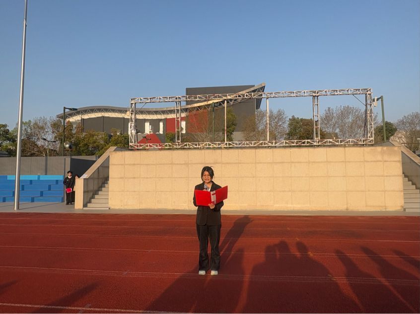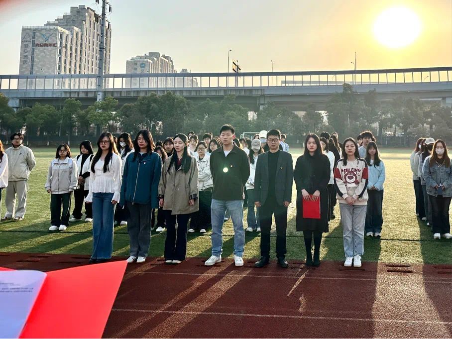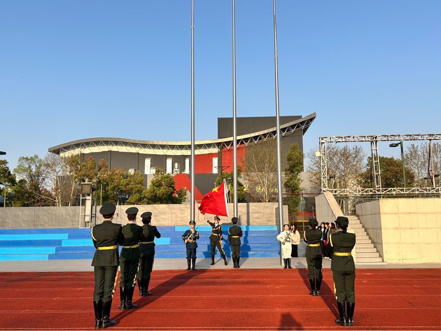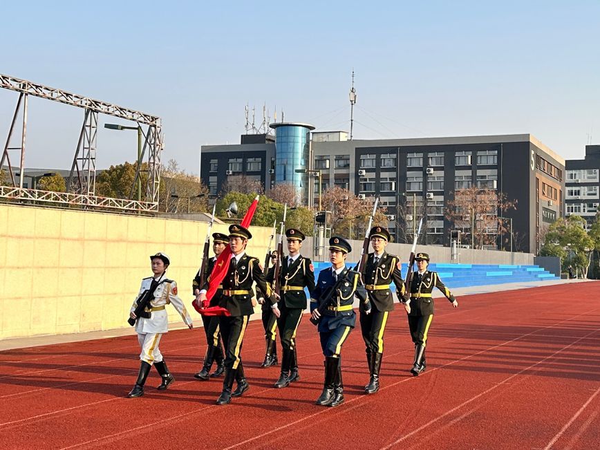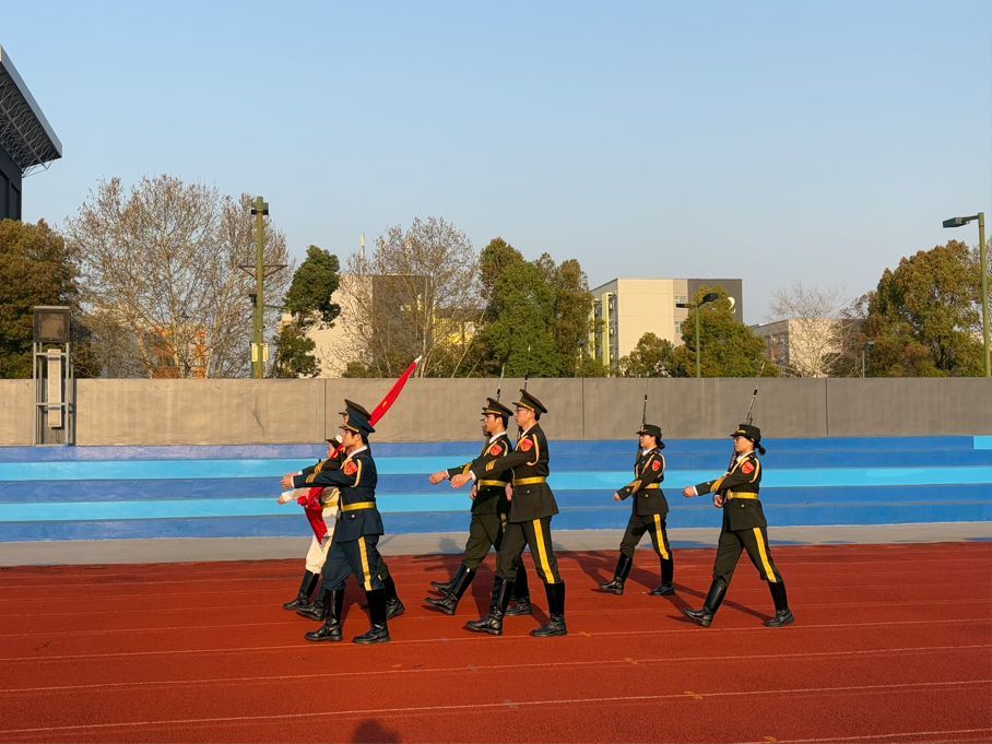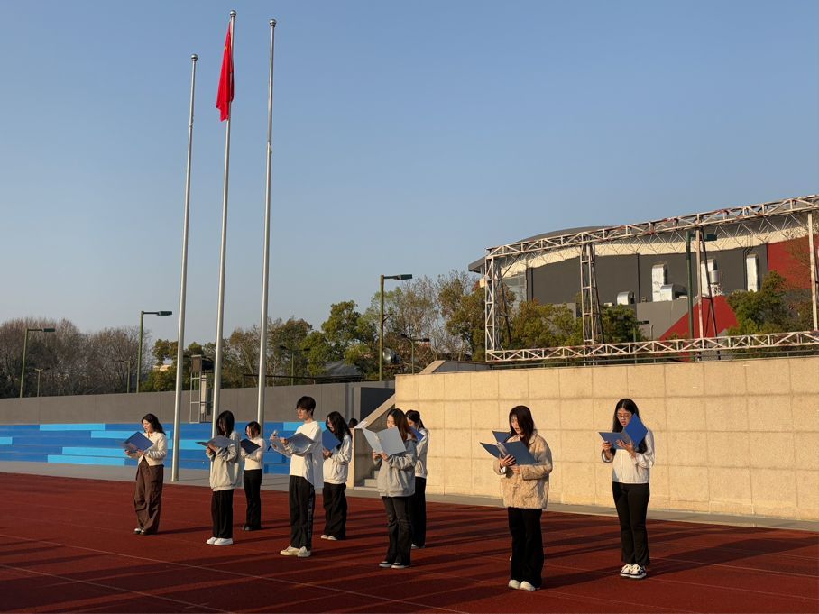 国旗护卫队迈着整齐有力的步伐护送国旗入场,他们身姿挺拔,目光坚毅,展现出高度的纪律性与使命感。在激昂的国歌声中,五星红旗缓缓升起,全体师生庄严肃立,向国旗行注目礼,高唱国歌,歌声响彻校园,抒发着对祖国的无限热爱与崇高敬意。