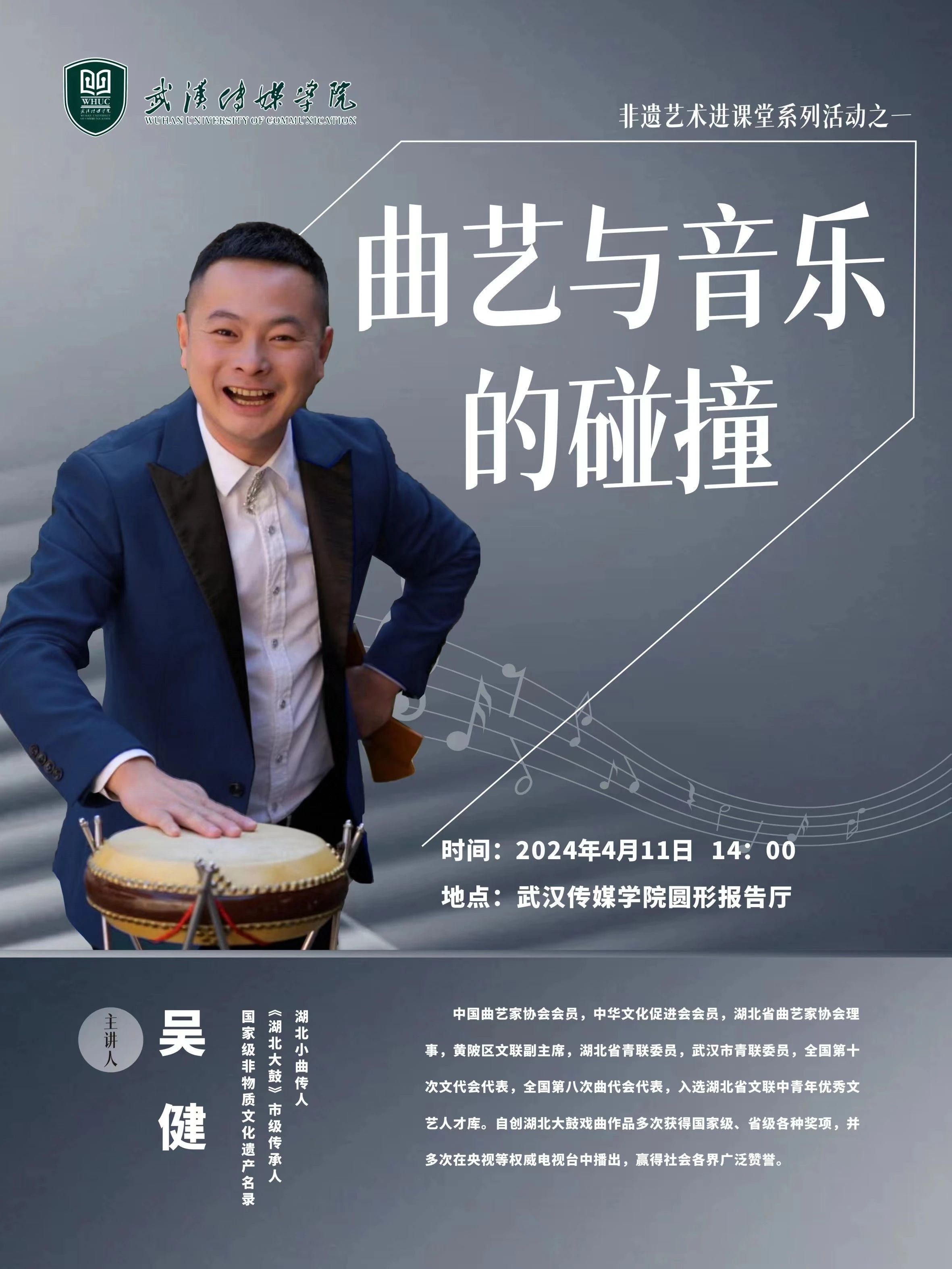 在这个美好的春日里,音乐表演专业诚挚邀请大家前来参加一场精彩绝伦的文化盛宴!这次,我们有幸邀请到了吴健先生,国家级非物质文化遗产名录《湖北大鼓》市级传承人与湖北小曲传人,将为大家呈现一场别开生面的湖北大鼓表演!