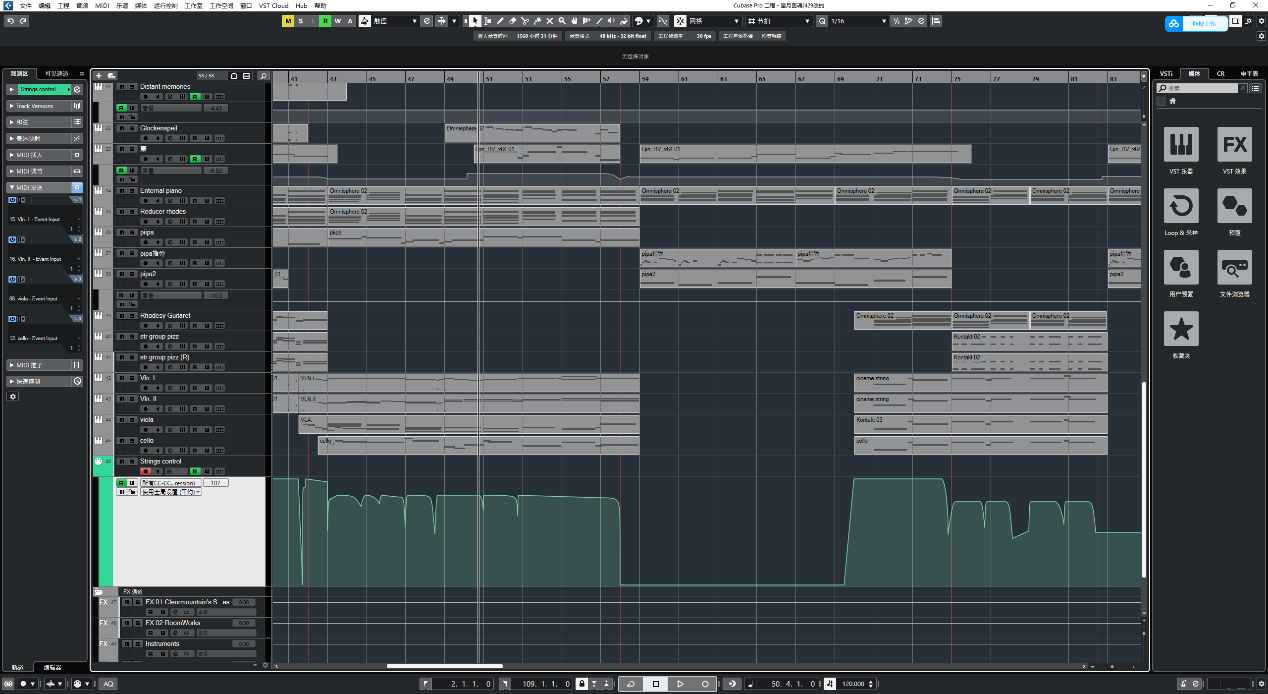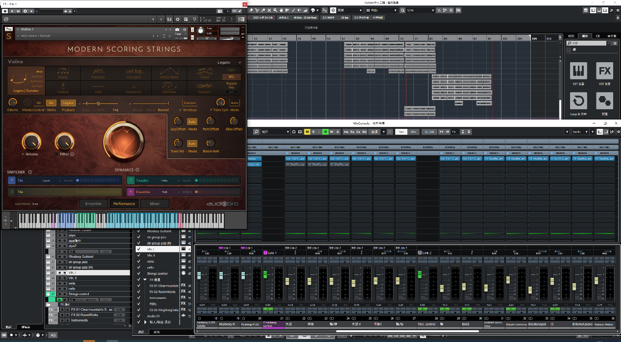 为了让弦乐听起来更加真实和自然,我们在弦乐的音色选择上也花了很长时间,从常用的LASS II到EastWest白金弦乐,再从柏林管弦乐到好莱坞管弦乐,最终我们把目光锁定在了较新的Modern scoring strings,事实证明它给我们的编曲带来了非常好的弦乐队效果。