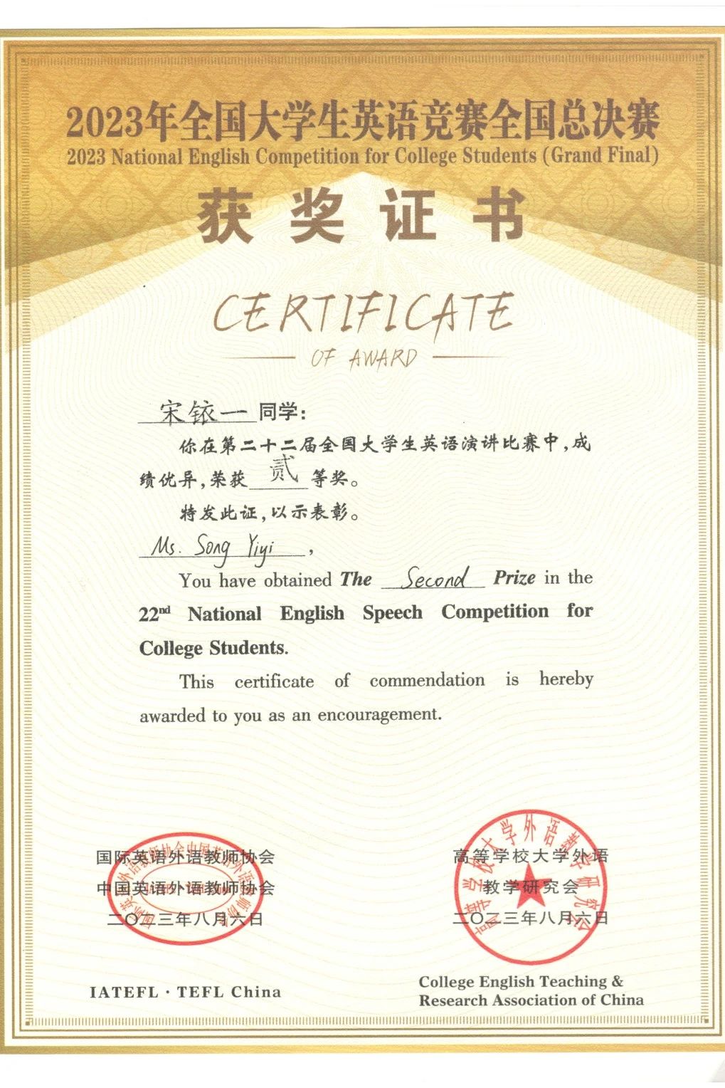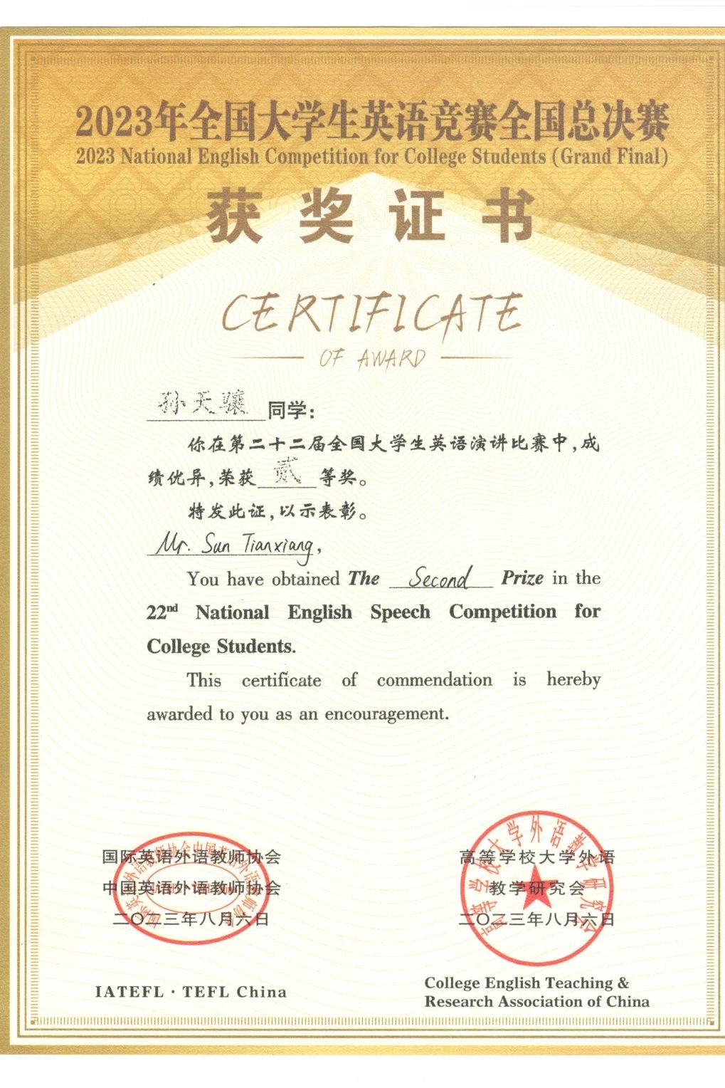 他们的努力终究没有白费,孙天骧同学在总决赛演讲比赛和辩论赛中均取得了二等奖的优异成绩,宋铱一同学也在全国总决赛演讲比赛中荣获二等奖。他们的成绩是他们英语知识能力扎实的证明,是他们不断挑战自我,超越自我的见证,更是他们老师们聪明才智和辛勤劳动的结晶。