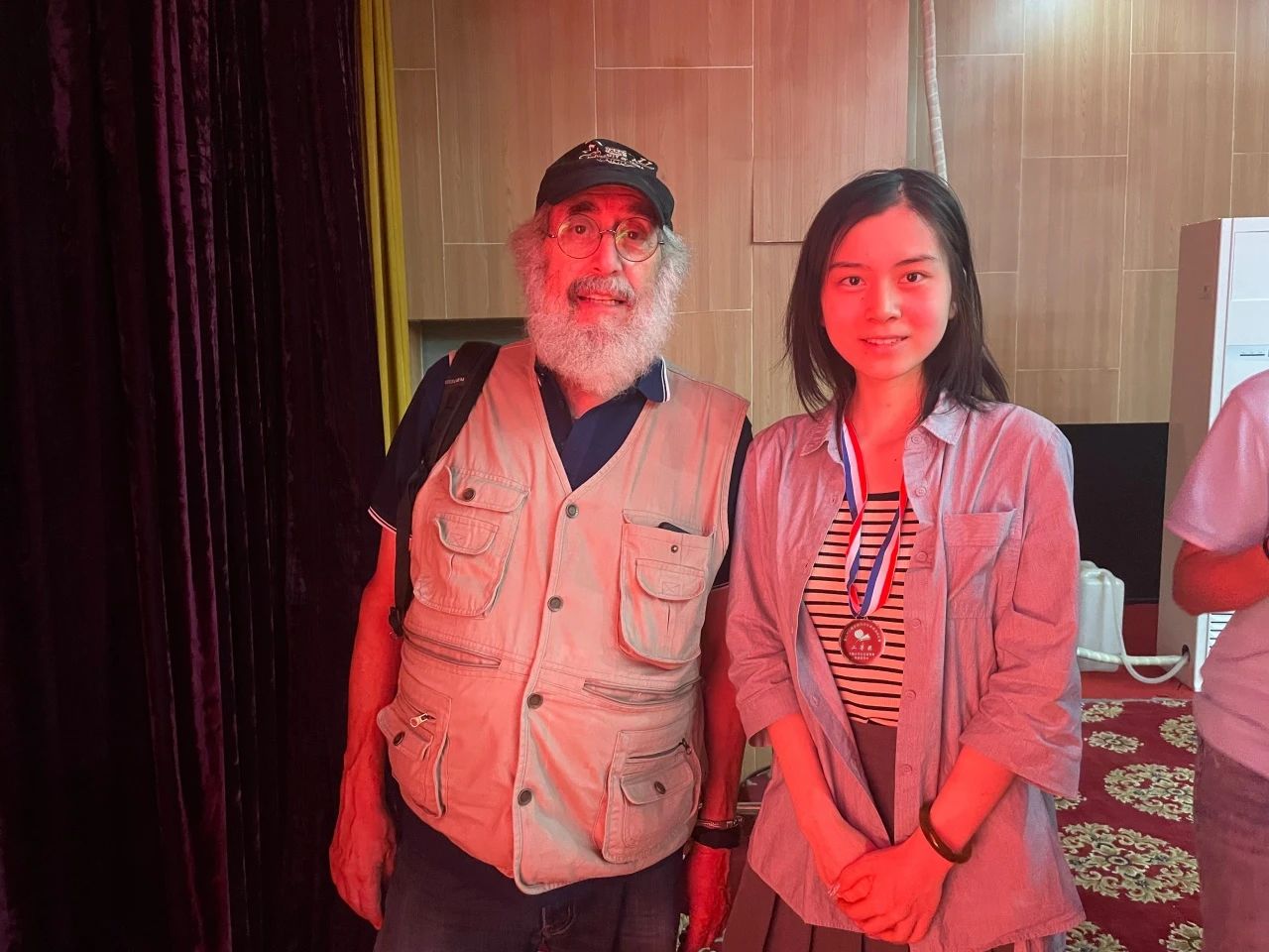 (图为宋铱一同学与外籍专家评委合影及两位同学所获奖牌展示)