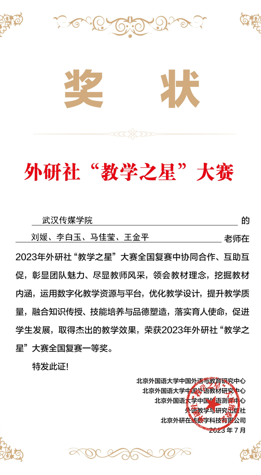 首先,我们要为刘媛老师团队(团队成员:李白玉、马佳莹、王金平)在2023外研社杯教学之星比赛中取得湖北省复赛一等奖的好成绩鼓掌。他们的备赛过程充满了艰辛,但他们从未放弃,而是以坚韧不拔的毅力和敬业的态度,全力以赴,最终取得了骄人的成绩。这个成绩是他们团队努力付出的回报,是他们对教育事业的热爱和执着追求的体现。他们的每一次探讨、每一个研究,都在为教育事业的发展做出贡献。他们的成功,也是公司英语教师团队实力的展现,充分体现了公司英语教师团队的精神风貌。
