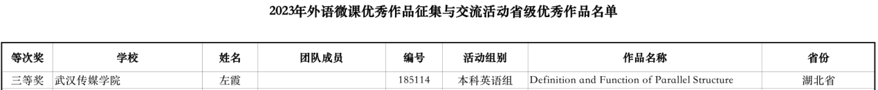 接着,要分享喜讯的是在2023年外语微课作品征集与交流活动中,荣获省级三等奖的左霞老师。