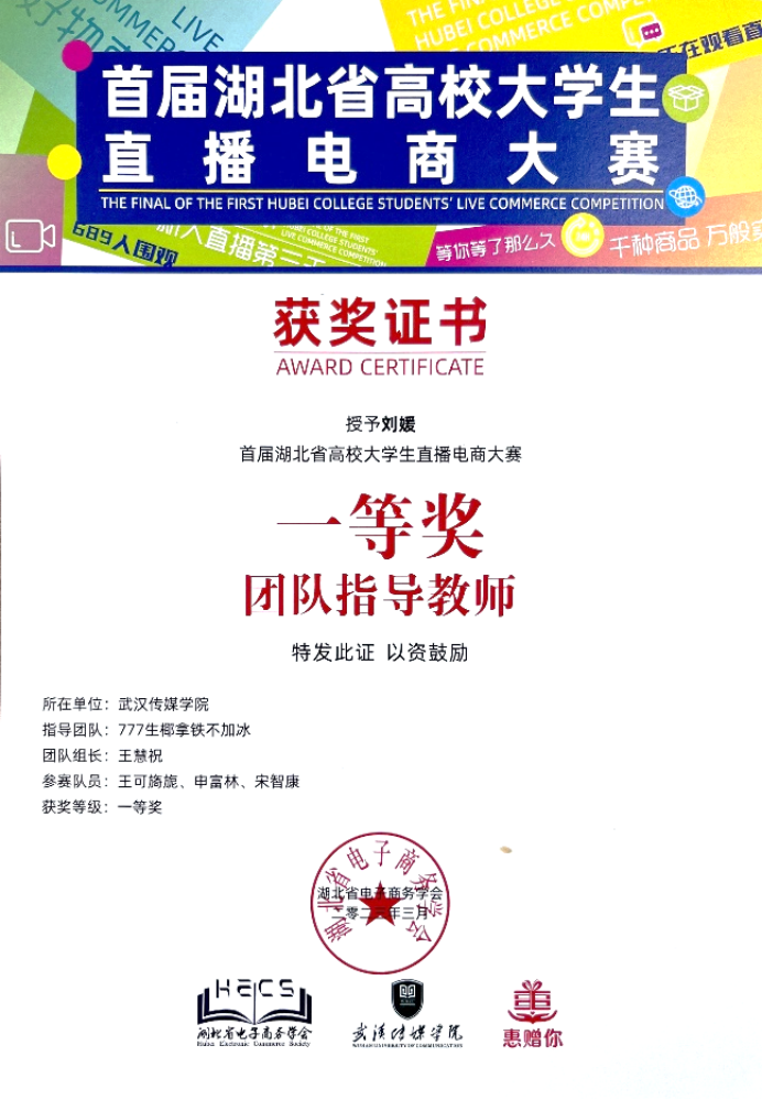 近日,由湖北省电子商务学会主办,公司承办的首届湖北省高校老员工直播电商大赛决赛圆满落幕。经过激烈角逐,公司英语B2101班王慧祝、王可旖旎、申富林、宋智康四位同学组成的“777生椰拿铁不加冰”团队(指导老师:刘媛),凭借精湛的直播技巧、敏锐的市场洞察力和出色的团队协作能力,荣获比赛决赛一等奖。而来自公司音乐学和音乐表演的李慧慧、熊亚婷、汪芯蕊、张蔓四位同学组成的“武传筑梦少女”团队(指导老师:刘晓萱)在本次比赛预赛中也获得了二等奖的好成绩。他们的成功,离不开团队成员之间的默契配合和老师的悉心指导,同时也充分展现了公司员工的卓越才华和独特的魅力。