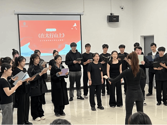 随后,王帧帧同志通过几首经典革命音乐,带领学员们穿越历史长河,感受中国革命的波澜壮阔。《黄河船夫曲》中,船夫们在惊涛骇浪中奋力拼搏的身影跃然眼前,激昂的旋律和高亢的歌词展现了中华民族不屈不挠的精神;《保卫黄河》将课堂气氛推向高潮,明快有力的节奏唱出了中华儿女共同抵御外敌、保家卫国的决心;《在太行山上》的赏析与学唱环节中,悠扬而深沉的旋律描绘了太行山上游击健儿的英勇形象和军民鱼水情。合唱团的同学们用纯净而富有感情的歌声,将这首经典歌曲演绎得淋漓尽致。《五月的鲜花》的旋律响起,青年学子对祖国的热爱与对敌人的仇恨交织其中,展现了民族危亡时刻广大青年挺身而出的壮烈情怀。