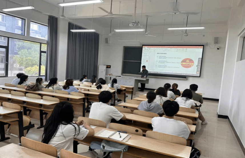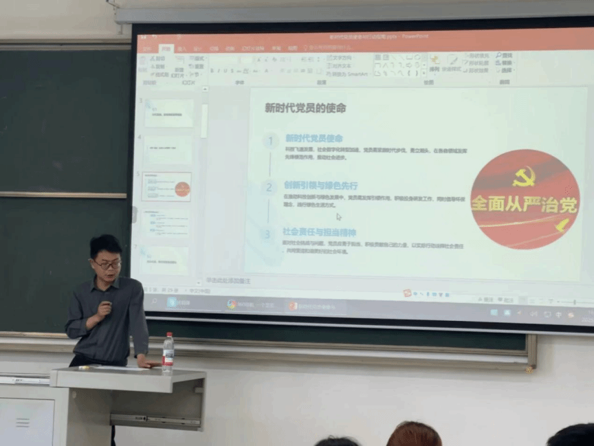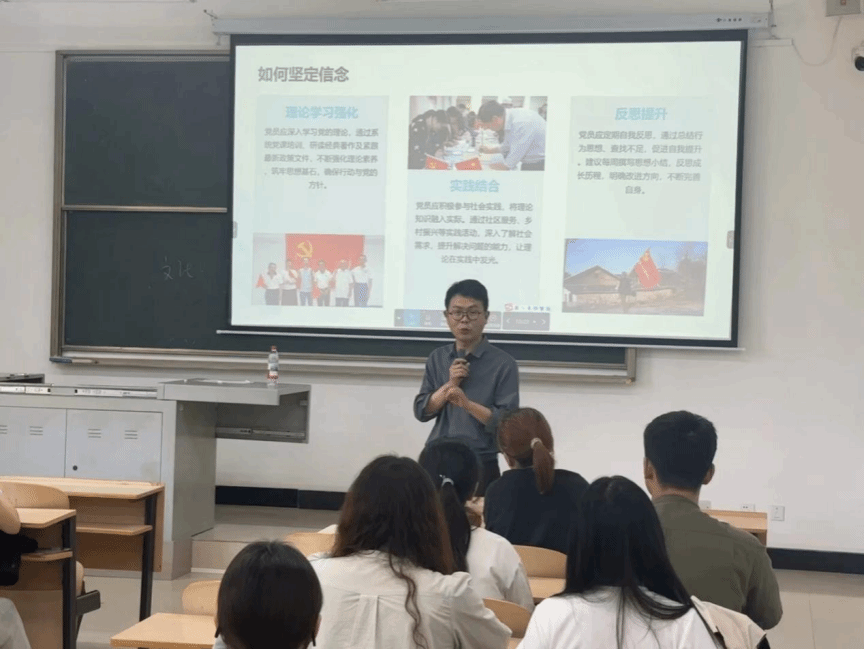 党课伊始,吴斌老师先通过提问的方式引出了新时代党员应承担起责任这个话题,他强调面对新时代的挑战与机遇,党员们需紧跟时代步伐,勇做先锋。他说理想信念是共产党人精神上的“钙”,是指引方向的灯塔、凝聚力量的磁石和支撑克服困难的基石。因此,党员们需要不断加强理论学习,通过系统党课培训、研读经典著作等方式,筑牢思想基石。同时,鼓励我们积极参与社会实践,将理论知识融入实际,以实际行动践行党的宗旨。